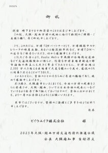 企業情報2025年11月5日大阪府知事より御礼状をいただきました。